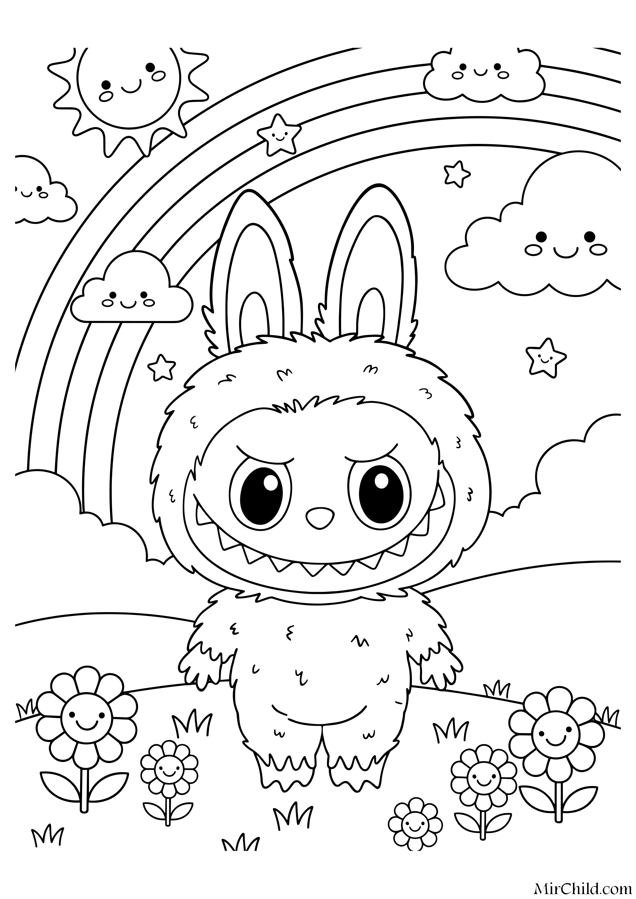 Раскраска игрушки Лабубу - Лабубу в счастливой стране (англ. Labubu in a happy land). Скачать и распечатать бесплатно.