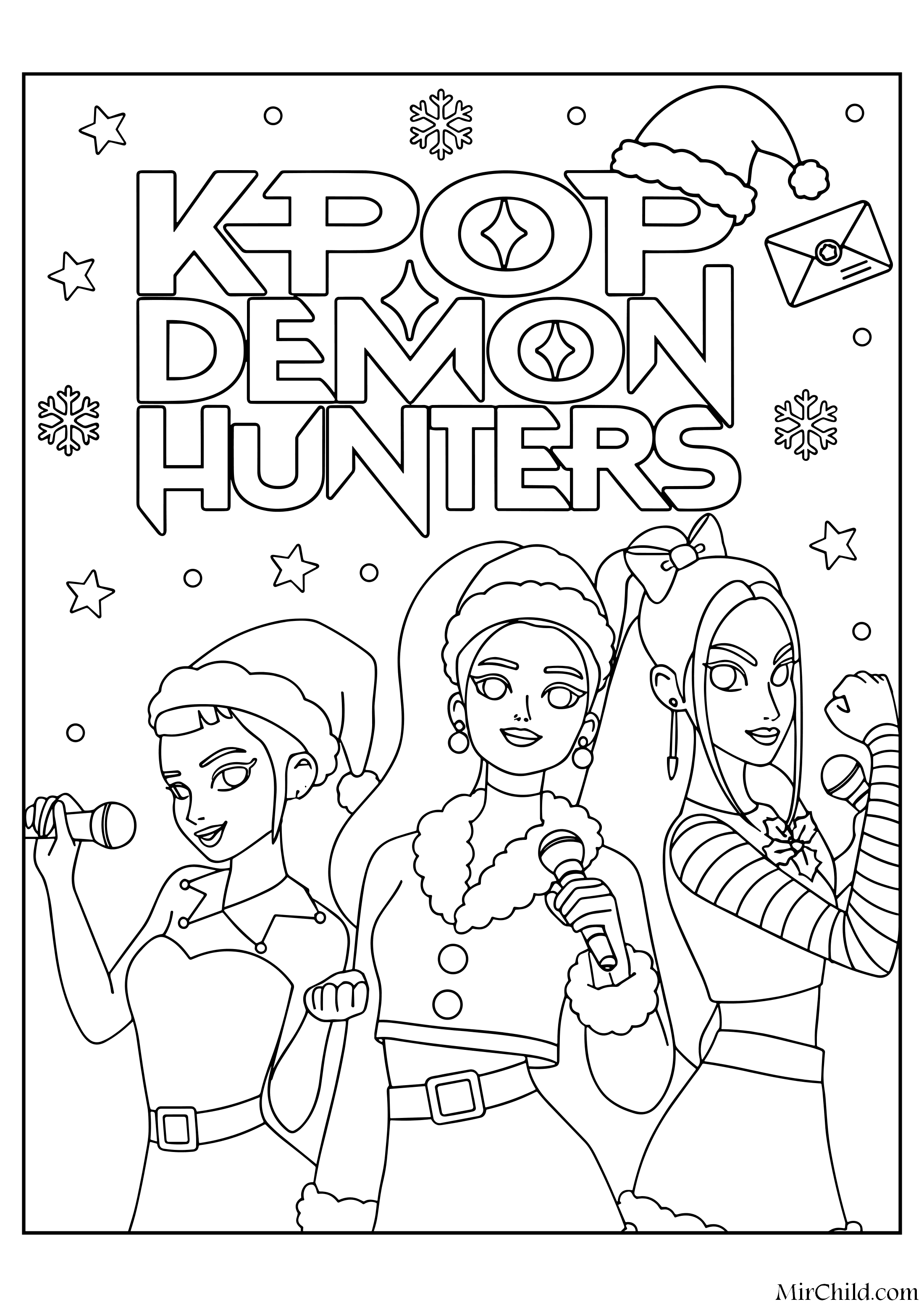 Раскраска для детей - Рождественская группа Huntrix (англ. Huntrix Group Christmas) из мультфильма "Кейпоп-охотницы на демонов" (англ. KPop Demon Hunters) 2025. Скачать и распечатать бесплатно.