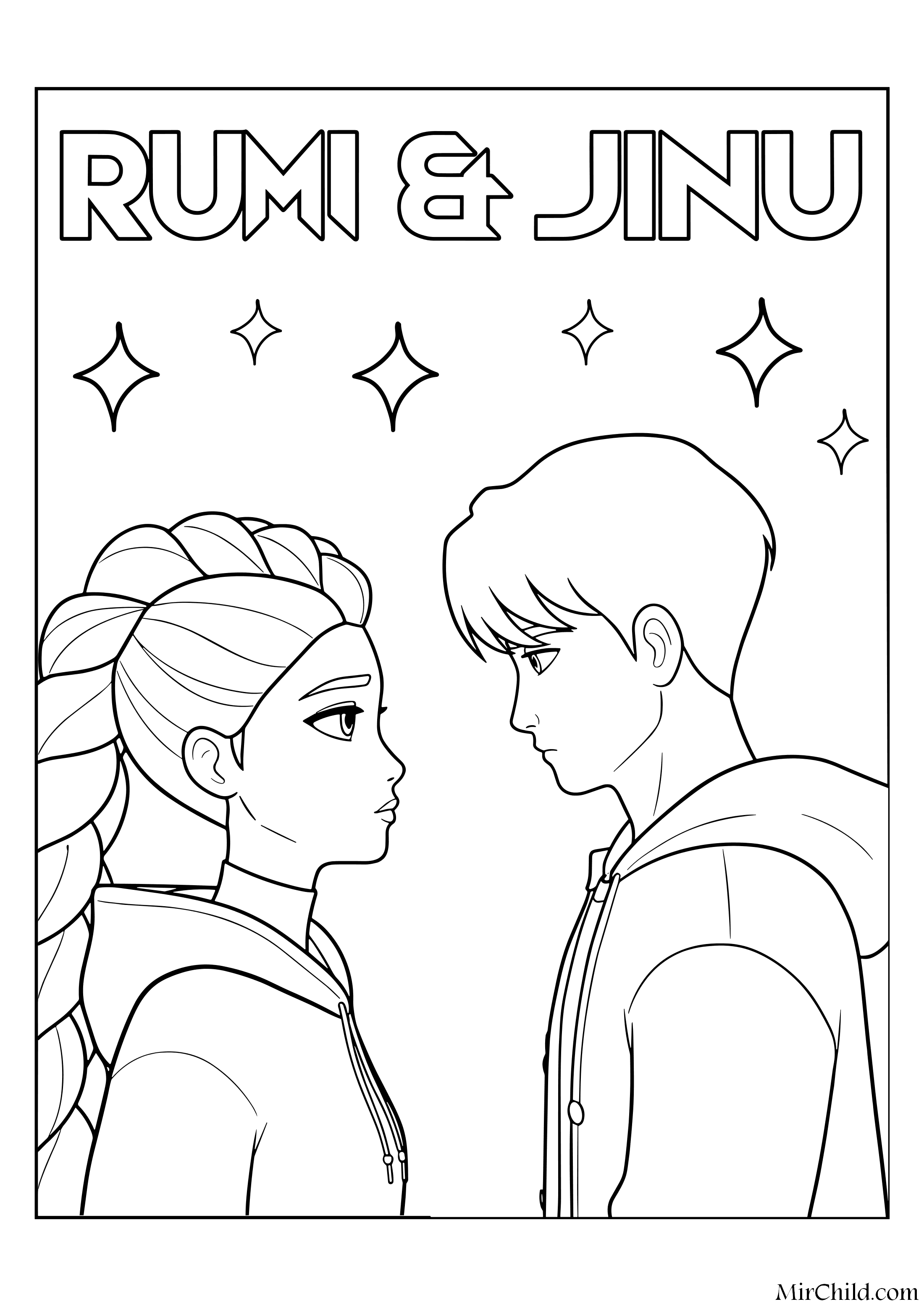 Раскраска для детей - Руми и Джину Saja Boys (англ. Rumi and Jinu Saja Boys) из мультфильма "Кейпоп-охотницы на демонов" (англ. KPop Demon Hunters) 2025. Скачать и распечатать бесплатно.