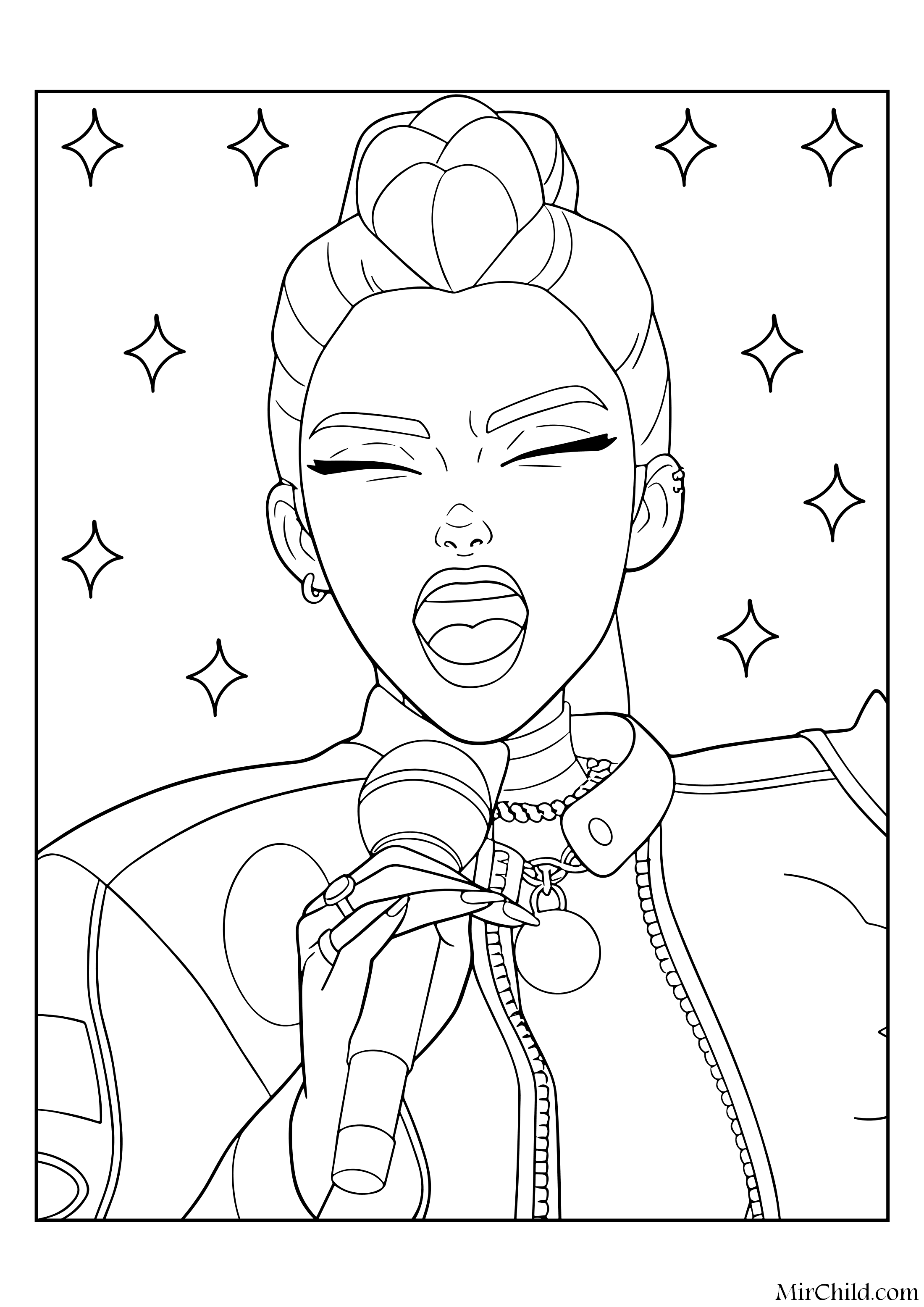 Раскраска для детей - Руми с микрофоном поёт (англ. Rumi sings with a microphone) из мультфильма "Кейпоп-охотницы на демонов" (англ. KPop Demon Hunters) 2025. Скачать и распечатать бесплатно.