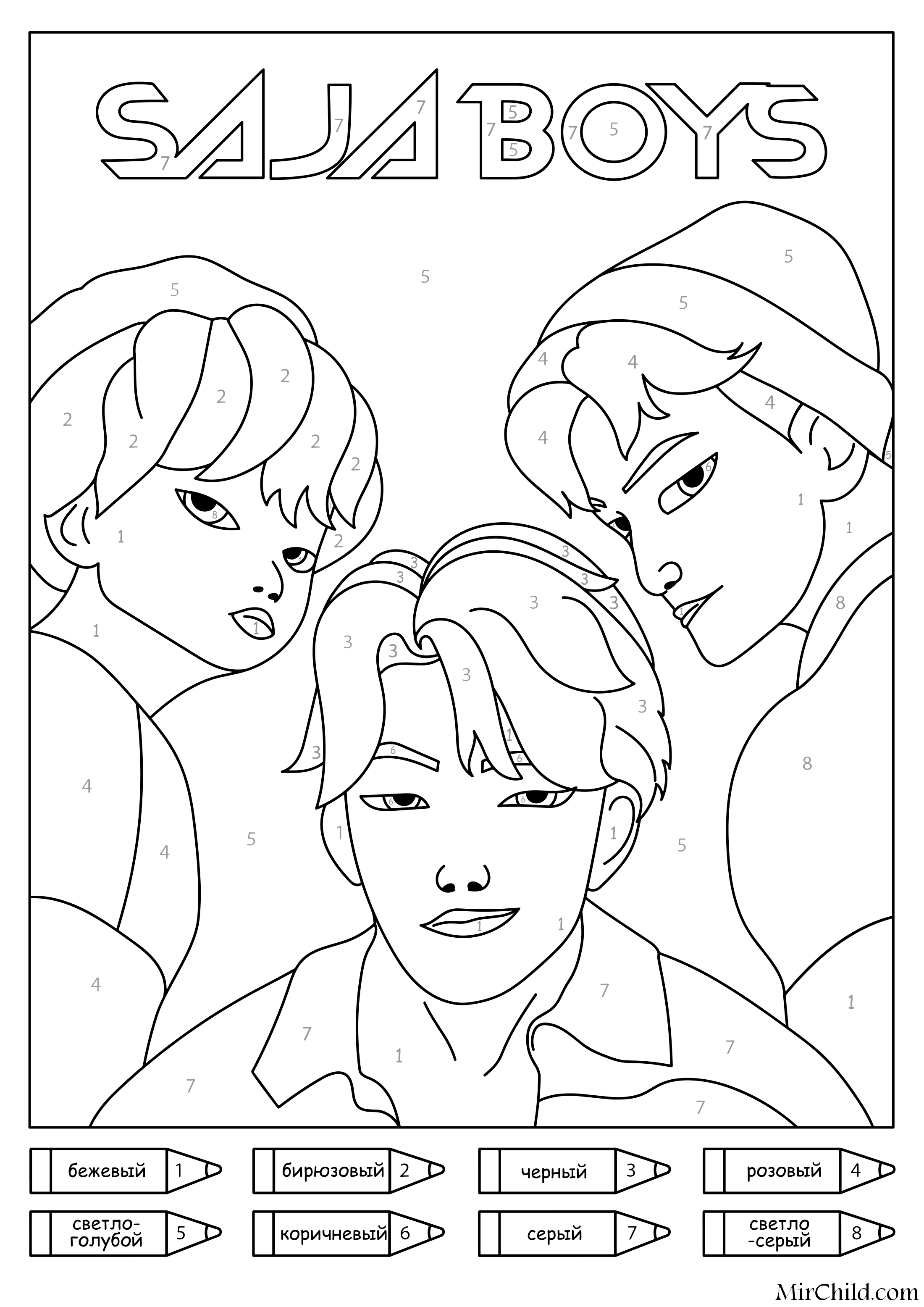Раскраска для детей - Saja Boys раскраска по номерам (англ. Saja Boys coloring by numbers) из мультфильма "Кейпоп-охотницы на демонов" (англ. KPop Demon Hunters) 2025. Скачать и распечатать бесплатно.