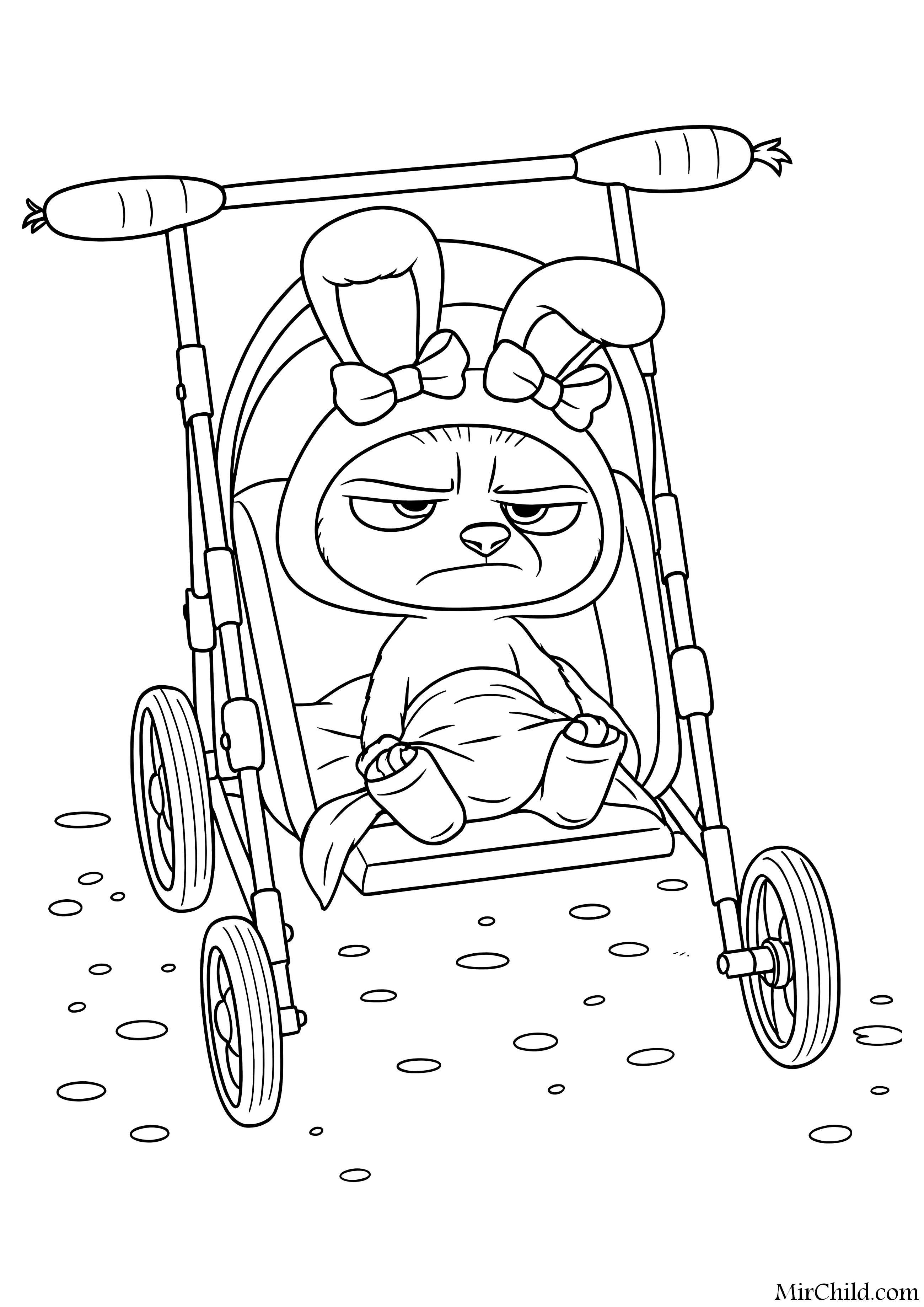Раскраска для детей - Ворчливый малыш в коляске с кроликом (англ. Grumpy Baby in Bunny Stroller) из мультфильма "Зверополис 2" (англ. Zootopia 2) 2025. Скачать и распечатать бесплатно.