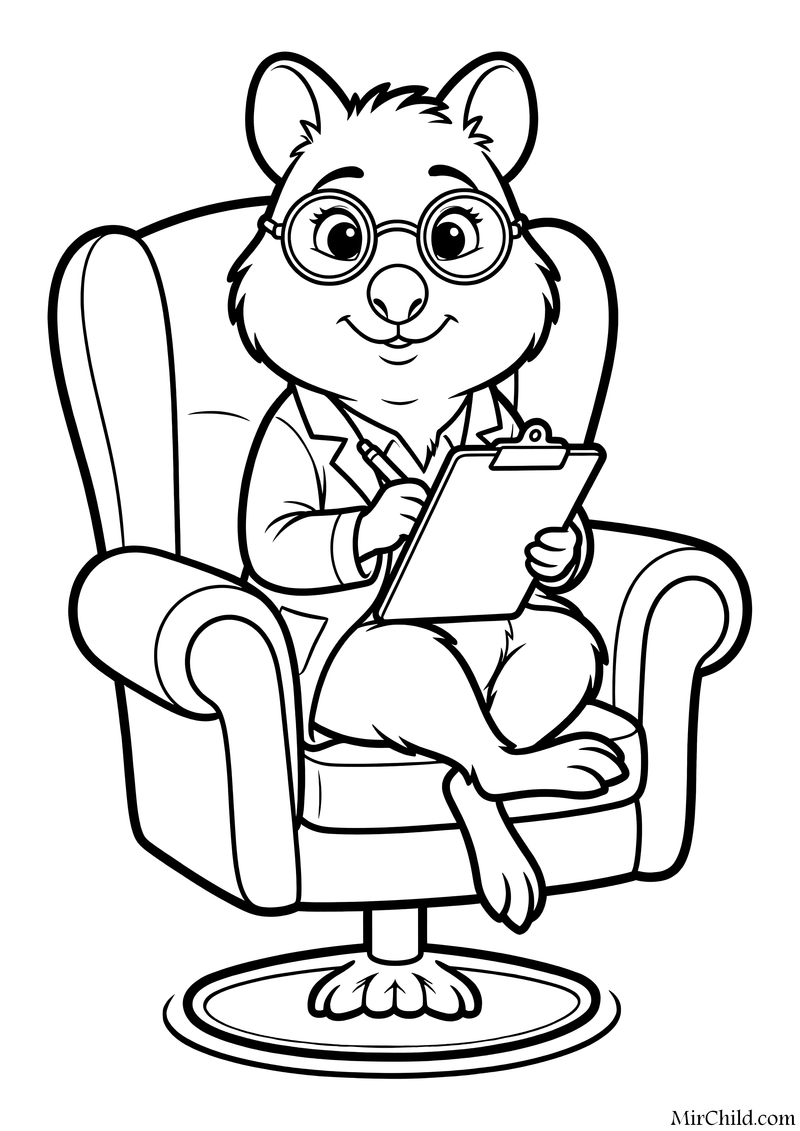 Раскраска для детей - Знаменитая поза доктора Няшби на стуле (англ. Dr. Fuzzby Iconic Chair Pose) из мультфильма "Зверополис 2" (англ. Zootopia 2) 2025. Скачать и распечатать бесплатно.